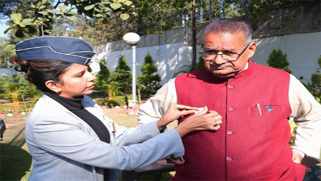 सशस्त्र सेना झंडा दिवस के अवसर पर सैनिक कल्याण मंत्री गणेश जोशी को फ्लैग लगाते विभाग के अधिकारी