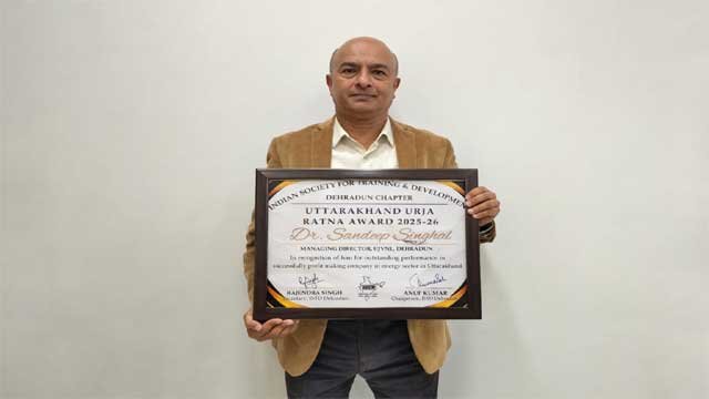 देहरादून: यूजेवीएन लिमिटेड के प्रबंध निदेशक डॉ. संदीप सिंघल को इंडियन सोसाइटी फॉर ट्रेनिंग एंड डेवलपमेंट (ISTD) के देहरादून चैप्टर द्वारा “Transforming Work and Workforce Expectations:The New People Agenda” विषय पर आयोजित कॉन्फ्रेंस में ऊर्जा के क्षेत्र में उनके उत्कृष्ट योगदान के लिए प्रतिष्ठित “उत्तराखंड ऊर्जा रत्न पुरस्कार 2025-26” से सम्मानित किया गया। डॉ. सिंघल को यह सम्मान यूजेवीएन लिमिटेड को ऊर्जा क्षेत्र में सतत् लाभ कमाने वाले निगम के रूप में स्थापित करने में उनके उल्लेखनीय योगदान के लिए प्रदान किया गया। डॉ . संदीप सिंघल के कुशल नेतृत्व में यूजेवीएन लिमिटेड ने वित्तीय रूप से सुदृढ़ता प्राप्त करने के साथ ही प्रदेश की ऊर्जा क्षमता में वृद्धि तथा तकनीकी उन्नयन की दिशा में भी कई महत्वपूर्ण कार्य किए हैं। यूजेवीएन लिमिटेड की वित्तीय स्थिति काफी मजबूत है तथा निगम कई वर्षों से राज्य सरकार को उनके पूंजी निवेश पर लगातार लाभांश देता आया है।