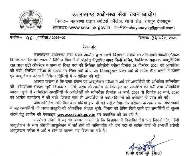 गौरतलब है कि आयोग द्वारा विज्ञापन संख्या 61/ उ०अ० से०च०आ०/2024 दिनांक 17 सितंबर 2024 के तहत इन पदों पर भर्ती के लिए लिखित परीक्षा 08 दिसंबर 2024 को आयोजित की गई थी। इसके बाद नियमानुसार टंकण एवं आशुलेखन परीक्षाएं तीन चरणों में सम्पन्न कराई गईं।
