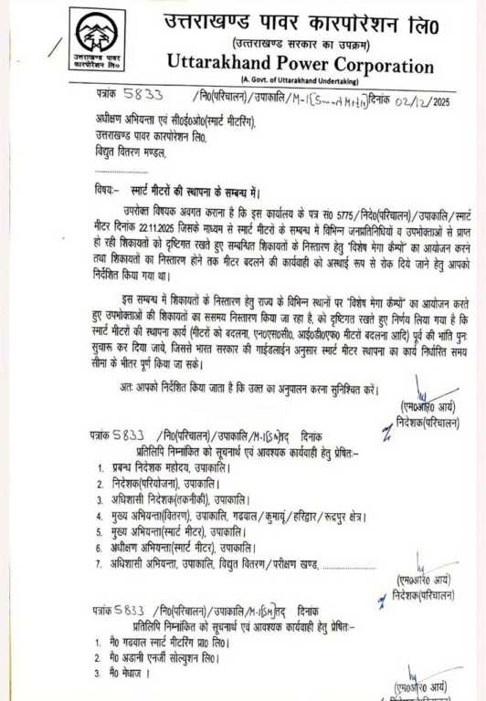 उत्तराखंड पॉवर कारपोरेशन लिमिटेड के निदेशक परिचालन एमआर आर्य ने कहा शिकायतों का निपटारा मेगा कैंप में किया गया है। जिसके बाद अब स्मार्ट मीटर लगाने का काम शुरू कर दिया गया है।